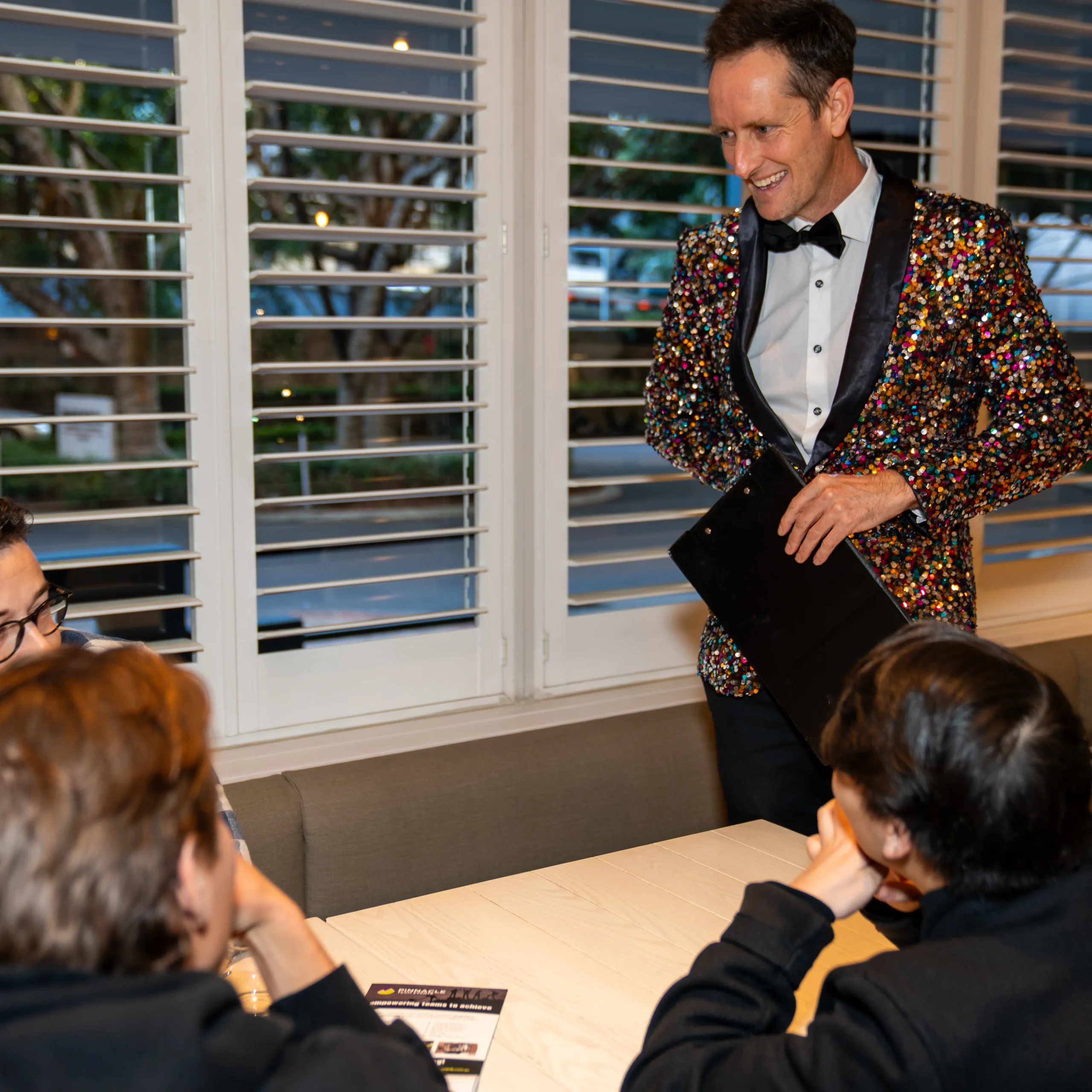 The activity can fit seamlessly between courses at a dinner event, as standalone entertainment, or as part of a conference program.