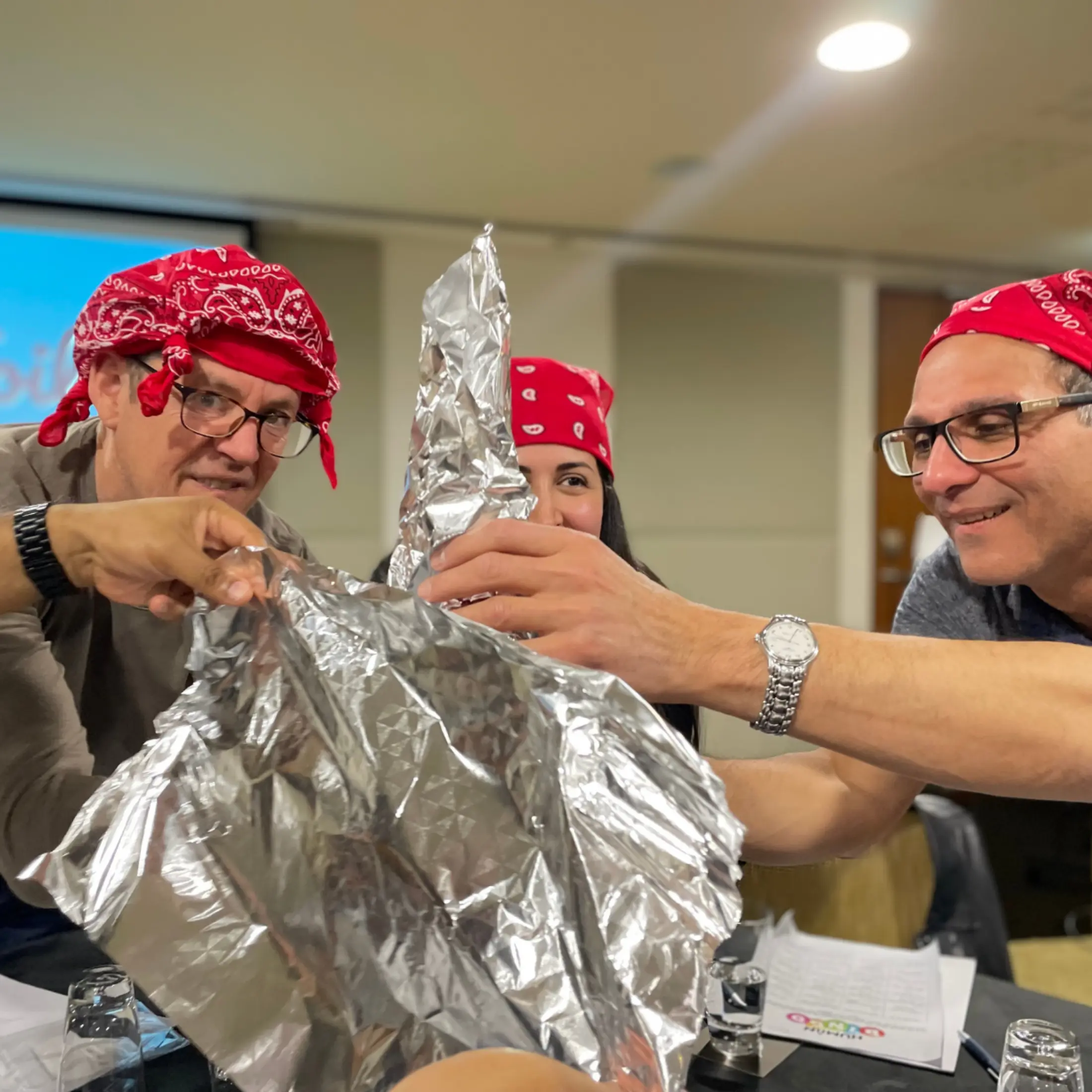 Teams are split into groups of approximately 8 participants. They compete in a series of indoor challenges, earning points for creativity, teamwork, and clever problem-solving. At the end of the session, the team with the highest points is celebrated as the winner. Challenges can be adapted to suit your group size, time constraints, or room layout.