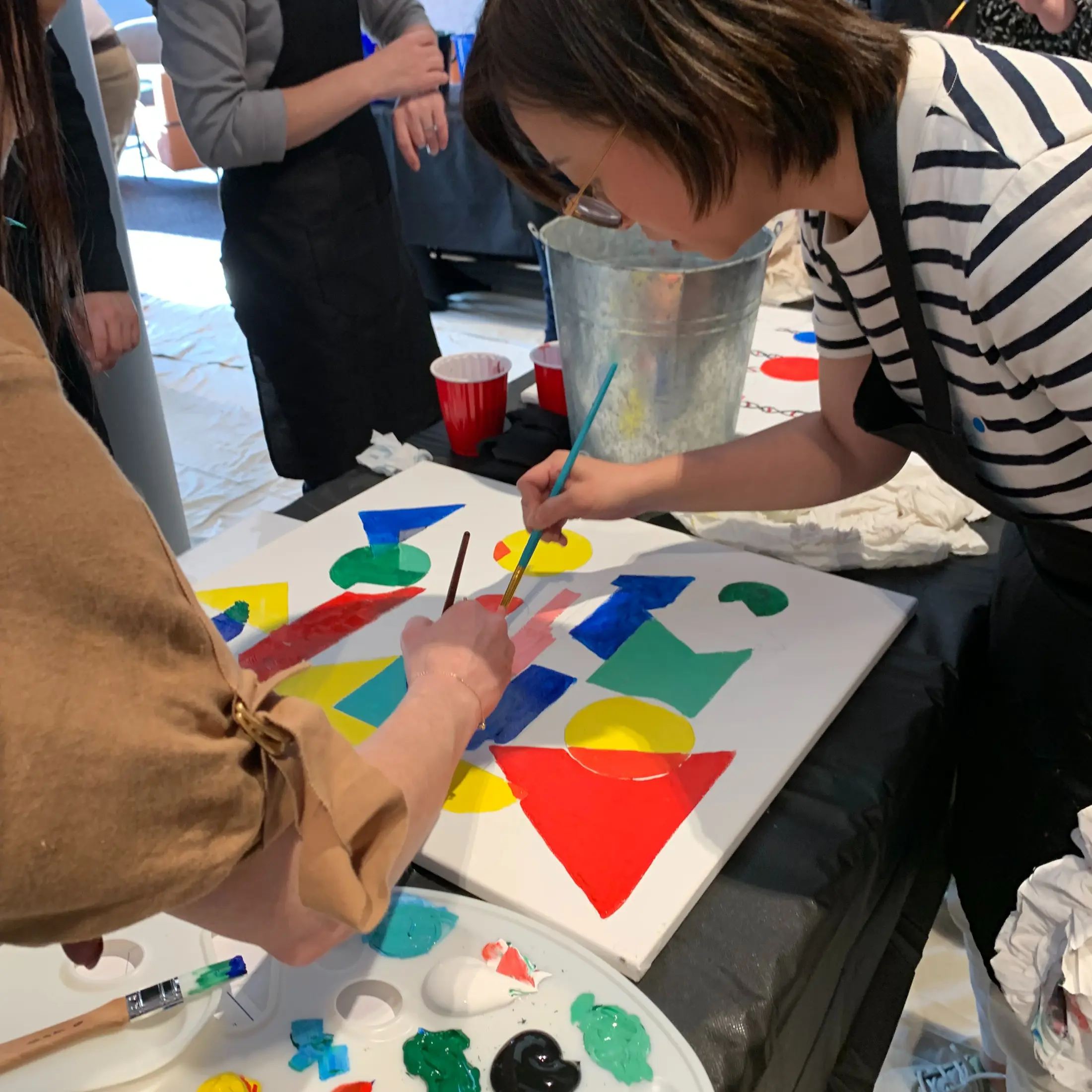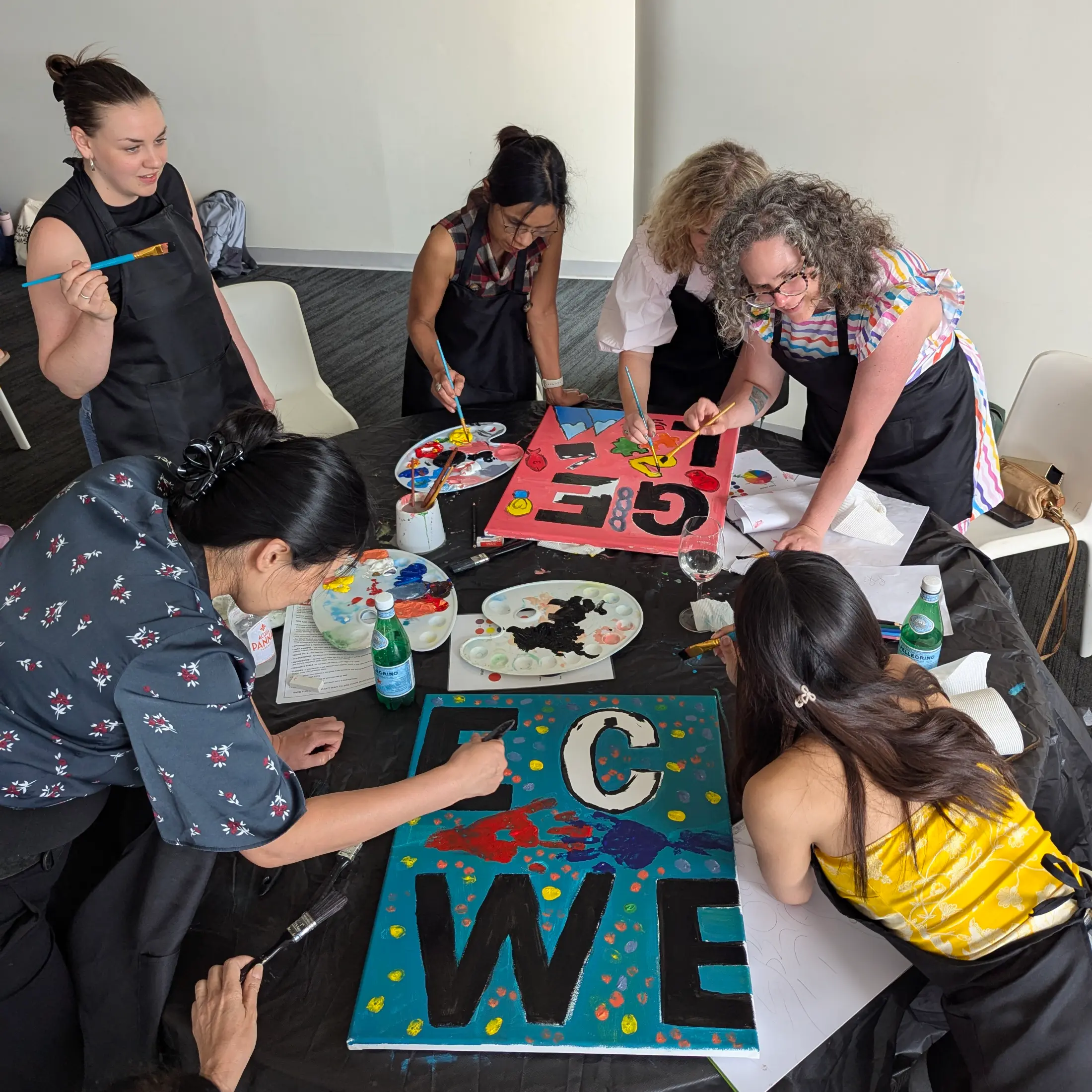 Teams of 6–8 participants receive a canvas, paints, brushes, and a black shape to guide their design. Each team brainstorms and plans their interpretation before painting their section of the canvas, collaborating and problem-solving along the way. Once all artwork is complete, the canvases are brought to the front of the group and displayed in order, revealing the full, overarching message. The session usually takes around two hours, including setup, and the finished artwork can be displayed, photographed, or returned to your premises for ongoing inspiration.